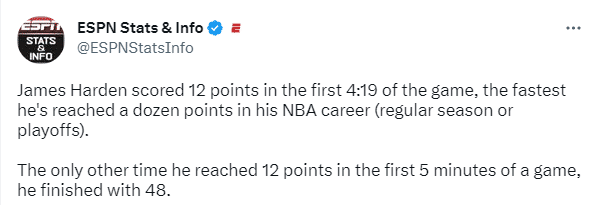 哈登第一节打满12分钟,10投7中高效轰下16分,不过76人首节31-38落后7分。