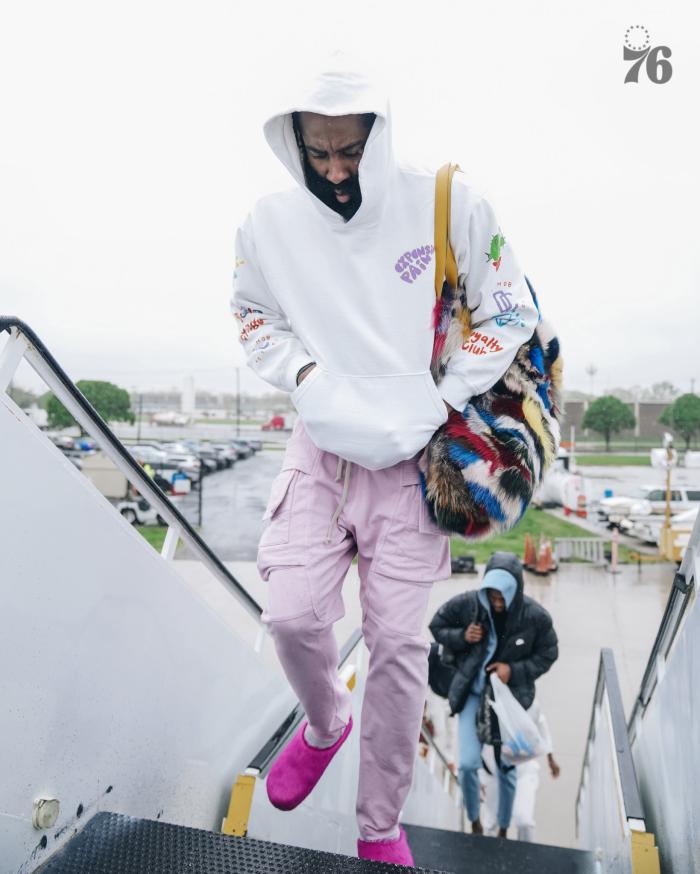 76人众将乘坐飞机前往波士顿,哈登身穿白色连帽卫衣、粉色拖鞋和浅粉色休闲裤,一脸愁容可能是冻得,大胡子的皮草单肩包十分抢镜。