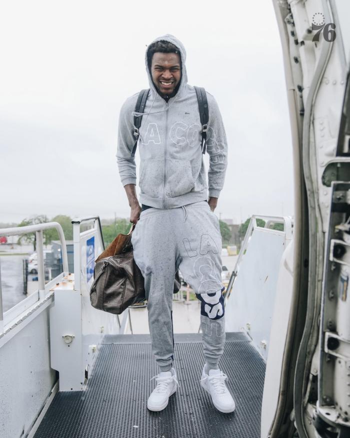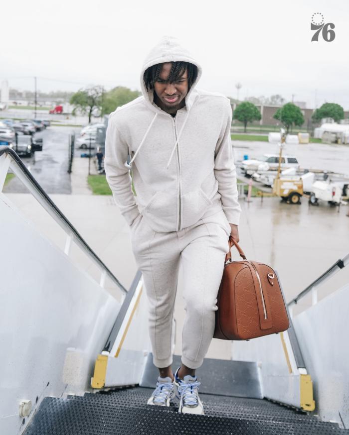 恩比德跟在哈登的后面,穿着羽绒服,随队出征,但大概率缺席半决赛G1。