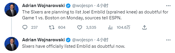 自从在4月21日对阵篮网扭伤膝盖后,恩比德缺席至今,养伤10天仍未痊愈,首轮出战3场比赛,场均拿到20分11.3篮板4助攻2.3盖帽1抢断。