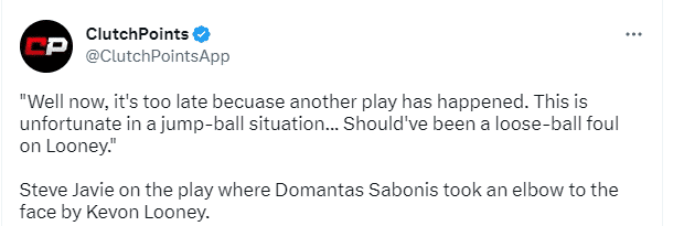 小萨用毛巾捂着面部走回替补席,迈克-布朗找裁判讨说法,对于这一次肘击事件,回访中心主任史蒂夫-贾维表示:好吧,现在已经太晚了,因为下一个回合已经开始了。这在跳球的情况下是不幸的,这应该是对卢尼的一次无球犯规。