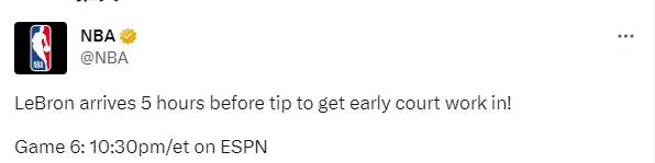 G5关键一战,詹姆斯全场17投5中,仅仅拿到12分,赛后詹姆斯自责打得太糟糕,放话要在G6打得更好;而今天赛前,詹姆斯提前5个小时来到球馆训练备战,这足以看出他对本场比赛的重视程度,今日目标自然是赢球从而拿下系列赛。