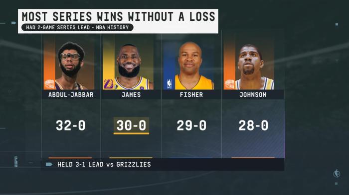 据统计,詹姆斯在季后赛取得两场比赛的领先时还从未输过系列赛,30胜0负的系列赛战绩位居NBA历史第二多,仅次于贾巴尔,具体情况如下: