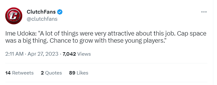 乌度卡称赞了小贾巴里-史密斯和小波特,还提到他在小贾巴里-史密斯还上大学时,经常会看小贾巴里的比赛。乌度卡还表示,他在接受面试前看了大约10场火箭的比赛录像,认为伊森是一位很突出的球员。