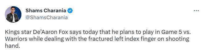 福克斯在这轮系列赛中发挥出色,4场季后赛场均31.5分6篮板7助攻2.5抢断。他能出战G5,对于国王来说无疑是一大利好。他是在G4一战的第四节意外受伤。