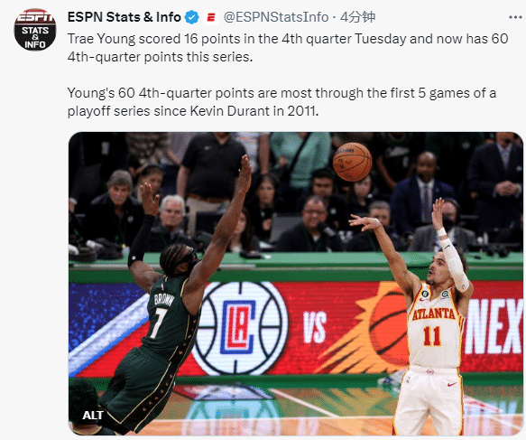 杨季后赛前5场末节累计拿到60分,成为2011年杜兰特后首位做到的球员