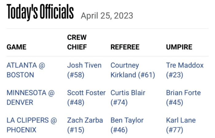 这场太阳VS快船G5的裁判是主裁:扎克-扎巴。第二裁判本-泰勒、第三裁判卡尔-莱恩、替补裁判雷-阿科斯。扎克-扎巴执法经验丰富,他还吹罚了去年的NBA总冠军,整体上扎克-扎巴的口碑还是很有的,曾经在超过100名NBA球员投票中,高居最受欢迎的裁判第二名。