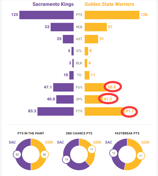 双方本场只差1分,不少数据都很接近,比如禁区得分都是50分,快攻得分勇士17-15,国王篮板53-51,两队的失误也是国王10-11。