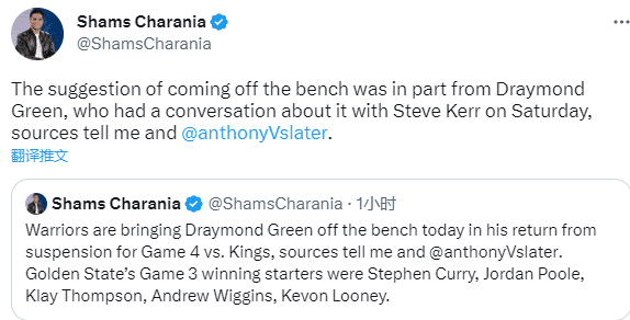 为何格林原因接受替补?名记Shams报道,追梦G4替补出战的部分建议来自于他自己,他在周五与科尔就此事进行了交流。