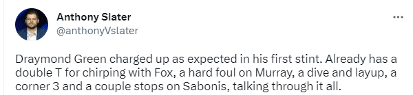 5分43秒,格林对穆雷凶狠犯规后,与福克斯激烈对喷,双方都吃到技术犯规;格林替补上场仅打39秒就领到一次技犯,福克斯也吃T,这火药味又来了。