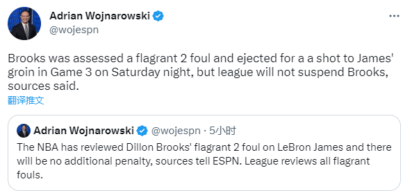 来源:JRS直播网04-24 11:48JRS直播网讯04月24日,狄龙-布鲁克斯会因袭击詹姆斯的裆部被联盟禁赛吗?据名记woj报道,联盟官方审查了狄龙对詹姆斯的二级恶意恶犯,不会有罚款以及禁赛的追加处罚。狄龙回应此事:媒体和球迷让我成为恶棍。