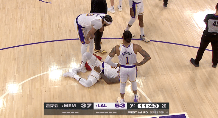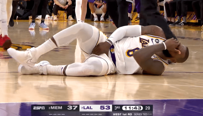 来源:JRS直播网04-23 12:01JRS直播网讯04月23日,NBA季后赛湖人G3主场对阵灰熊,下半场第三节,詹姆斯惨遭狄龙袭裆,痛苦倒地,裁判回放之后,升级判罚狄龙吃到二级恶犯被驱逐离场。