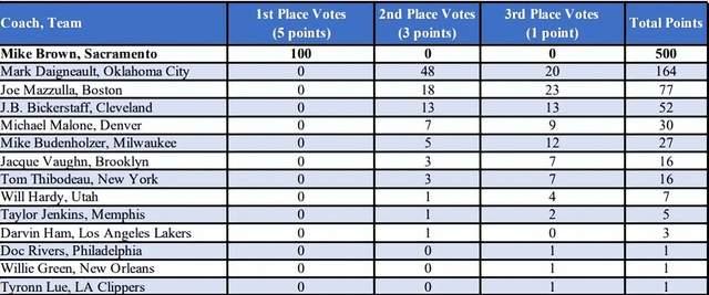 来源:JRS直播网04-20 10:58JRS直播网04月20日,NBA官方宣布,国王队主帅迈克·布朗正式当选为本赛季NBA年度最佳教练!而且根据官方消息,迈克·布朗获得了全部100张第一选票,创造历史。此外,湖人主帅哈姆得到1张第二选票。迈克·布朗的获奖实至名归,他也创下了多个历史纪录。