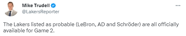 此前詹姆斯、浓眉和施罗德都被列为大概率出战,现在湖人官方已经宣布,詹姆斯、浓眉和施罗德都可以出战,湖人全员冲击连胜。