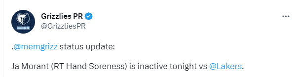 来源:JRS直播网04-20 10:27JRS直播网04月20日,NBA季后赛灰熊和湖人G2大战赛前,灰熊官方正式宣布,莫兰特因右手酸痛缺席比赛,灰熊当家球星因伤缺战G2;湖人众将帅气亮相,官宣詹姆斯、浓眉和施罗德都可以出战。