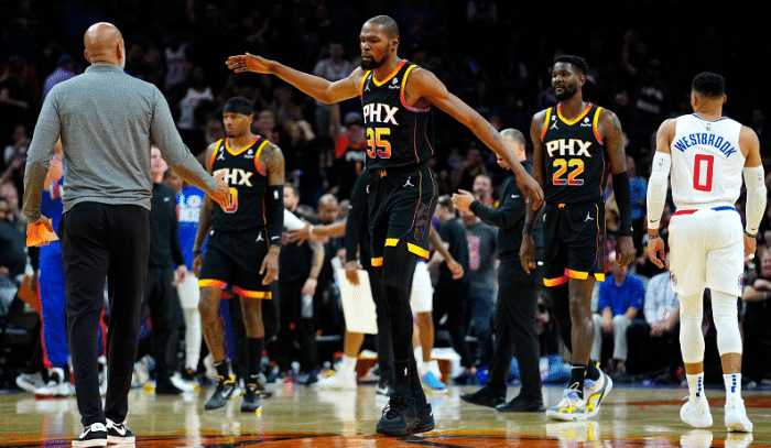 来源:JRS直播网04-19 16:19JRS直播网讯04月19日NBA季后赛西部首轮,太阳123-109战胜快船,系列赛大比分扳成1-1平,接下来将奔赴洛杉矶进行两场比赛。此役双方打得一波三折,快船第二节一度领先13分,布克和杜兰特爆发,半场前扳平比分。第三节的布克单节轰下18分,率队领先,莱昂纳德和威少紧咬比分差距。最后时刻快船连续失误,保罗接管了比赛,太阳成功拿下胜利。快船的莱昂纳德31分8篮板7助攻3抢断、威少28分5篮板5助攻。太阳的四巨头杜兰特25分6篮板5助攻、艾顿14分13篮板、布克38分9助攻、保罗16分4篮板8助攻。