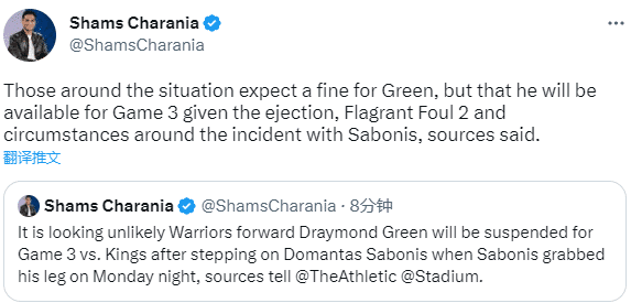 格林是否会被联盟追加禁赛?据名记shams报道,格林不太可能因脚踩国王前锋小萨博尼斯被禁赛。了解情况的人士透露,格林预计将会被罚款;格林预计将被允许出战系列赛第三场比赛。
