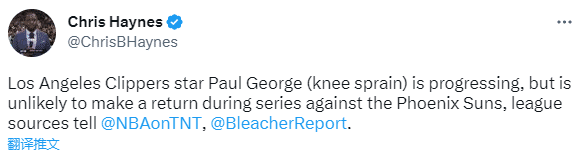 来源:JRS直播网04-17 15:49JRS直播网04月17日,据名记Chris Haynes和Woj报道,快船球星乔治的膝盖伤势回复取得进展,但他不太可能在与太阳的系列赛中复出;换言之,乔治很可能因伤首轮报销,大概率无缘复出战太阳。