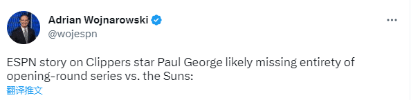 曝乔治或首轮报销!不太可能出战与太阳系列赛