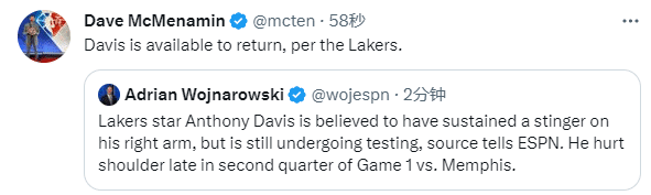 所幸浓眉的手臂伤势无大碍,据名记Dave McMenamin报道,浓眉下半场可以继续出战;上半场,浓眉出战18分钟,10投5中拿到10分6篮板2助攻4盖帽2抢断,湖人半场59-65落后6分。