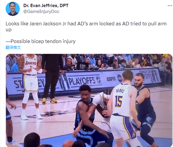 对于浓眉的伤势,医学专家Evan Jeffries表示浓眉可能遭遇二头肌肌腱损伤;据名记woj报道,浓眉的右臂刺痛,可能当时手臂神经被打到了。
