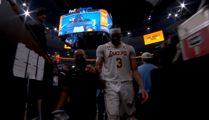 第二节1分15秒,在争抢篮板时和贾伦-杰克逊发生身体碰撞,戴维斯的手臂明显受伤,当时他告诉球队:我不能移动我的手臂。随后湖人请求暂停,湖人队医扶着他的手臂,浓眉离场返回更衣室接受检查。