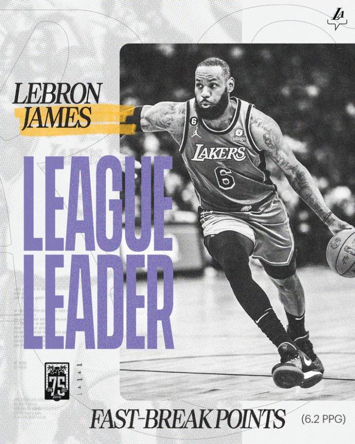 湖人官方晒出詹姆斯一大数据领跑联盟,本赛季他场均快攻拿到6.2分成为联盟快攻之王,38岁的老詹仍旧是赛场上能量十足的超级巨星,一旦快攻反击,对手确实无法阻挡全力詹。