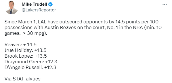 里夫斯对湖人也十分重要,据统计,自3月1日起,湖人球员里夫斯在场时,球队每百回合得分比对手多14.5分,全联盟排名第一(至少出战10场比赛,场均出场时间不低30分钟)。