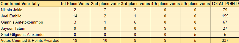 19位媒体人票选MVP的投票情况:恩比德获得14张第一选票,2张第二选票和1张第三选票,总得分为159分;约基奇获得2张第一选票、7张第二选票和2张第三选票,总得分为79分;字母哥3张第一选票,总得分为67分;另外塔图姆27分和亚历山大5分。