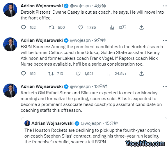 来源:JRS直播网04-10 17:31JRS直播网04月10日讯 ,NBA两大主帅下课,火箭解雇主帅塞拉斯,火箭新帅目标出炉,湖人旧帅和勇士主帅在列;活塞主帅凯西正式辞职,将进入球队管理层。
