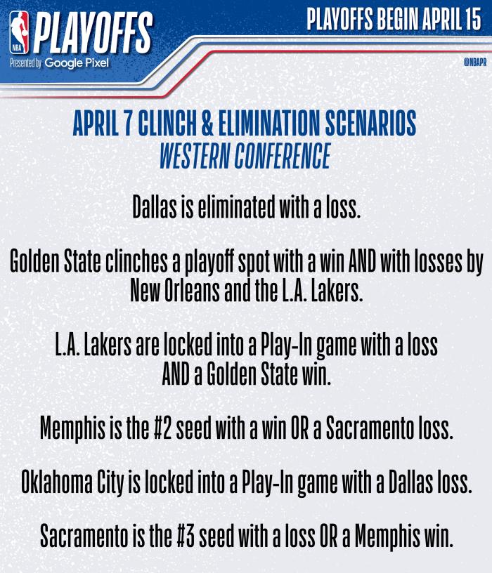 来源:JRS直播网04-08 15:55JRS直播网04月08日讯 ,NBA常规赛接近尾声,NBA官方详解了西部的形势,勇士最快今天锁定季后赛,独行侠可能出局无缘附加赛,湖人或赢球保留冲击前六的希望。