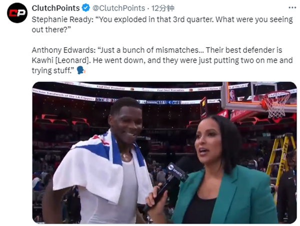 赛后谈到第三节爆发,爱德华兹表示:我看到大量的错位机会,他们最好的防守者科怀倒下了,他们只是尝试包夹我。