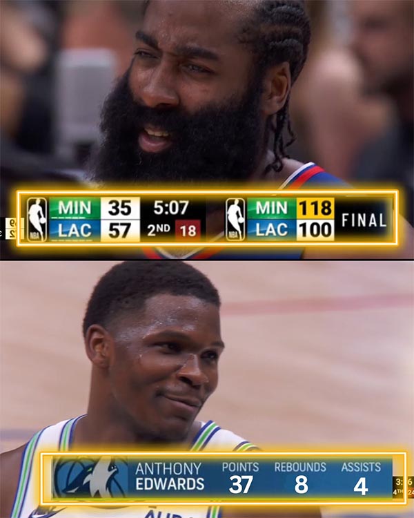 森林狼第一节21-34落后13分,第二节5分13秒森林狼落后到22分,之后森林狼疯狂反扑,爱德华兹和亚历山大-沃克带队20-2打回悬念,华子第二节独砍14分;下半场,森林狼第三节29-15反超比分,末节华子带队继续扩大领先,比赛还剩4分10秒,森林狼领先20分,快船撤下哈登和乔治等主力,提前放弃比赛,最终森林狼逆转拿下关键卡位战。