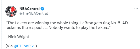 对于现在的湖人,名嘴尼克-怀特在节目中表示湖人将会赢得一切,勒布朗会夺得生涯第5个总冠军戒指,浓眉将会赢得尊重,没有人想在季后赛打湖人。