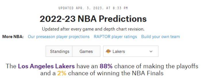 剩余赛程,湖人将会先后对阵爵士、快船、太阳和再战爵士,目前湖人喜提三连胜,全队凝聚力十足,目标直指直通季后赛;根据权威网站FiveThirtyEight最新预测,湖人晋级季后赛的概率为88%,大概率晋级季后赛。