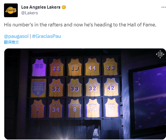 加索尔的16号球衣就挂着科比24号球衣的旁边。