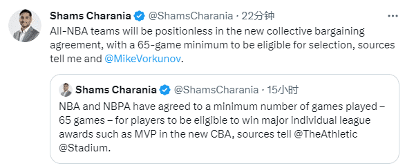 来源:JRS直播网04-02 10:47JRS直播网04月02日讯 ,NBA最佳阵容的评选新规出炉,据名记Shams报道,在新的劳资协议谈判中,NBA最佳阵容的评选将取消位置区分,且入选最佳阵容的前提条件是至少打65场比赛;新规将在新赛季开始执行,MVP的评选也需要至少打65场比赛。