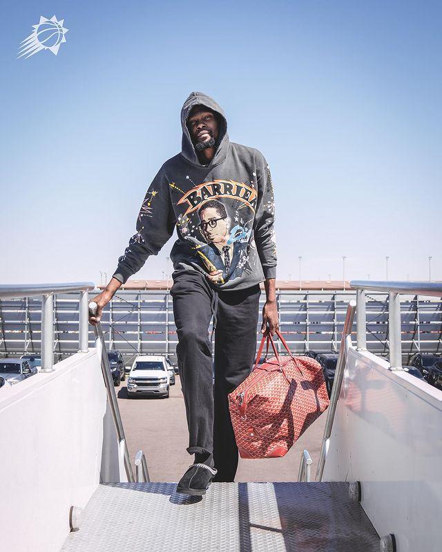 杜兰特身穿印花连帽卫衣亮相,提着一个红色行李包,登机时满脸笑容十分开心,露出白白的牙齿;杜兰特太阳生涯至今出战5场比赛,场均拿到25.2分6.8篮板,投篮命中率60%和三分命中率55%,杜兰特出战时太阳5胜0负保持全胜。