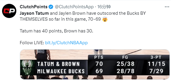 第二节,布朗3投1中仅贡献3分,但塔图姆续上火力,接连轰进3记三分,再加上霍福德等人输送火力,凯尔特人早早领先到30分,半场打完75-47领先雄鹿48分,塔图姆单节轰下15分;字母哥半场20分根本不足以抵抗绿军。