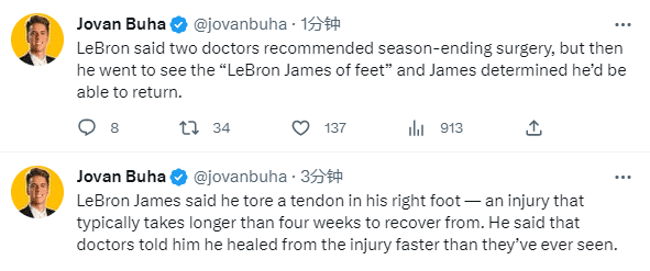 湖人输球赛后,詹姆斯表示自己之前遭遇了右脚肌腱撕裂,这种伤病通常需要超过四周的恢复时间。但医生们向詹姆斯表示,他从这类伤病中的愈合速度超过了他们以前见过的所有人。