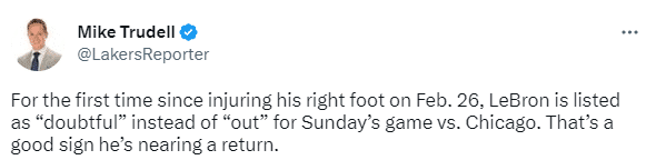 来源:JRS直播网03-26 11:23JRS直播网讯03月26日,湖人官方正式宣布,下一场对阵公牛,詹姆斯被列为小概率出战(25%可能性出战),医学专家称其接近复出,这是詹姆斯右脚肌腱损伤后首次被列为出战成疑,迎来复出的好兆头,也是湖人冲击西部前六的重大利好。