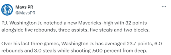 华盛顿打出独行侠生涯最佳一战,32分和5次抢断创独行侠生涯新高;过去3场比赛,华盛顿场均拿到23.7分6篮板3抢断。