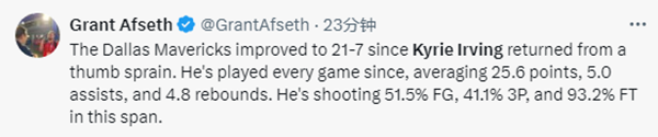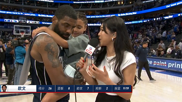 独行侠击败勇士赛后,欧文抱着女儿接受采访;今日一战,欧文贡献26分8篮板7助攻2抢断1盖帽,带队47胜30负稳坐西部第五;据统计,自从欧文从拇指伤势回归后,独行侠21胜7负强势来袭,期间欧文场均拿到25.6分5助攻4.8篮板。