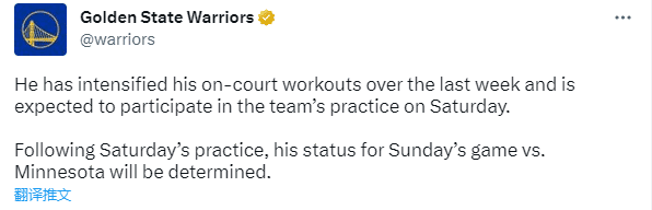 来源:JRS直播网03-24 15:28JRS直播网03月24日,勇士官方更新小佩顿的伤情,小佩顿昨天接受了复查,他的内收肌伤势康复进度良好;上周他提升了训练强度,预计本周日参加全队训练,最快可能在下周一对阵森林狼的比赛中复出。