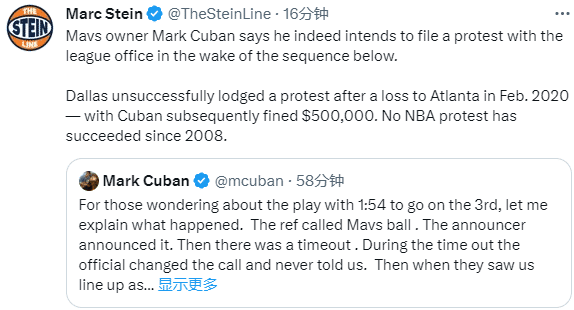 Marc Stein报道,独行侠在2020年2月输给老鹰的比赛后也曾提出过抗议,但未能成功,库班还因此被罚款了50万美元,自2008年以来,NBA就从未有过抗议成功的案例。