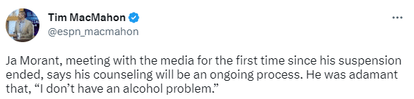 莫兰特复出预计生涯首次替补:告知球队愿先打替补 直言没有酗酒问题