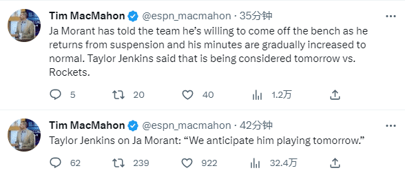 名记Tim MacMahon报道称,莫兰特已告知球队,考虑到自己刚刚解禁,他愿意出任替补的角色,之后再慢慢恢复自己的上场时间。而主帅詹金斯对此表示,球队会考虑明天让莫兰特复出。