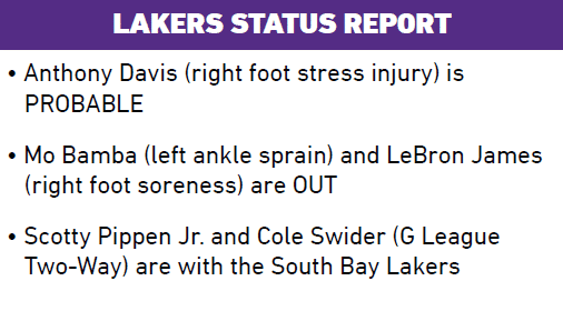 詹姆斯预计将在周五接受复查,也许到时就能知道老詹的具体复出时间,据此前报道,老詹有望出战最后4-5场比赛;浓眉预计继续带伤出战太阳,目前湖人没有签下特里斯坦-汤普森或者托尼-布拉德利的计划;到目前为止,湖人35胜37负排在西部第11位,落后西部第6的勇士1.5个胜场,常规赛最后10场比赛,湖人有望迎来全员冲击季后赛。