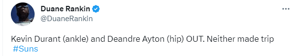 太阳队则是杜兰特(脚踝扭伤)和艾顿(臀部伤势)双双缺战湖人,而且他们两人没有随队前往洛杉矶,而是落在凤凰城安心养伤。