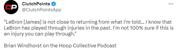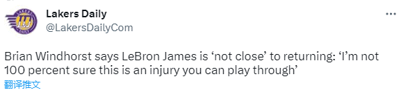 ESPN名记Brian Windhorst表示:据我所知,勒布朗距离回归赛场还早。我知道大家都在说3周这个时间点,但我觉得,3周是非常清楚的官方重新评估的时间,但并不代表他就会在三周后直接回归。我知道勒布朗过去曾带伤打过球,但我不是100% 确定他是否可以克服这一次的伤病。